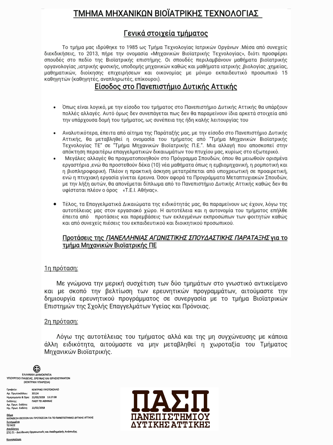 - Αναλυτικότερα, έπειτα από αίτημα της Παράταξής μας, με την είσοδο στο Πανεπιστήμιο Δυτικής Αττικής, θα μεταβληθεί η ονομασία του τμήματος από "Τμήμα Μηχανικών Βιοϊατρικής Τεχνολογίας ΤΕ" σε "Τμήμα Μηχανικών Βιοϊατρικής Π.Ε.". Μια αλλαγή που αποσκοπεί στην απόκτηση περαιτέρω επαγγελματικών δικαιωμάτων του πτυχίου μας, κυρίως στο εξωτερικό.