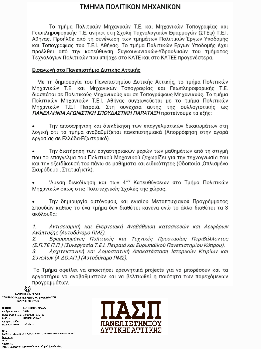 ΠΡΟΤΑΣΗ ΠΑΣΠ ΠΟΛΙΤΙΚΩΝ ΜΗΧΑΝΙΚΩΝ