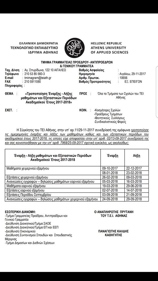 ΤΡΟΠΟΠΟΙΗΣΗ ΕΝΑΡΞΗΣ-ΛΗΞΗΣ ΜΑΘΗΜΑΤΩΝ ΚΑΙ ΕΞΕΤΑΣΤΙΚΩΝ ΠΕΡΙΟΔΩΝ 2017-2018